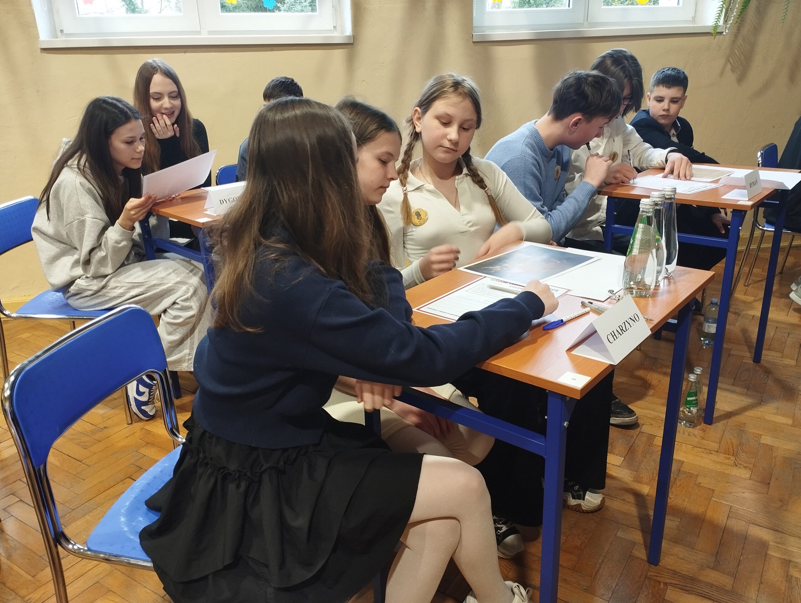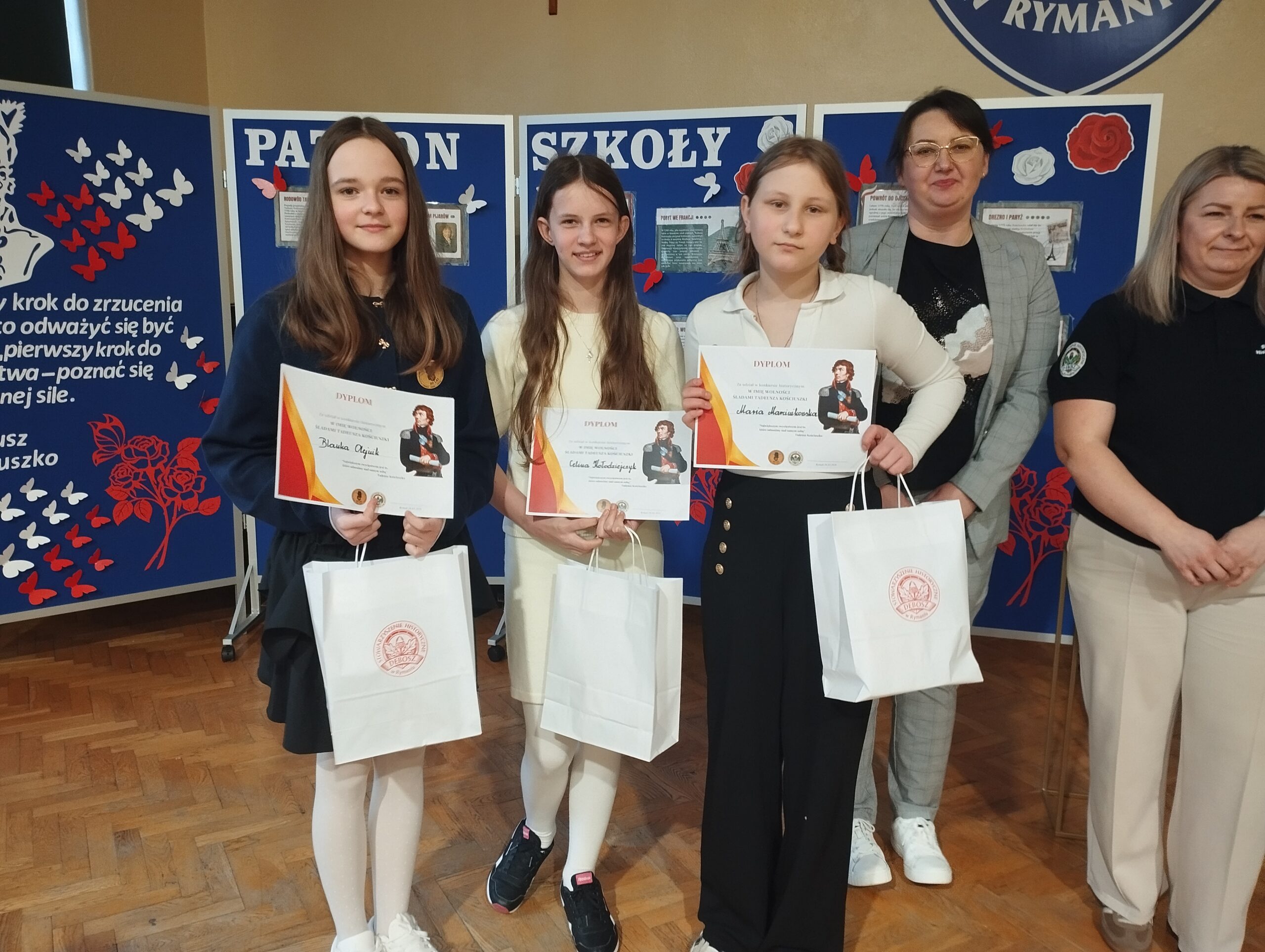 W Szkole Podstawowej im. Tadeusza Kościuszki w Rymaniu w dniu 26.03.2026r. odbył się konkurs historyczny z okazji 80-lecia szkoły. W konkursie udział wzięło 9 szkół z regionu gminy Siemyśl, Gościno, Dygowo, Rymań i Sławoborze. Szkołę z Charzyna reprezentowały uczennice klasy V: Maria Marcinkowska, Celina Kołodziejczyk i Blanka Olejnik. Uczennice wykazały się dużą wiedzą ze znajomości m.in. życiorysu Tadeusza Kościuszki, insurekcji kościuszkowskiej oraz udziału Kościuszki w amerykańskiej wojnie o niepodległość. Wszyscy uczestnicy otrzymali upominki i dyplomy. Gratulujemy i życzymy dalszych sukcesów.