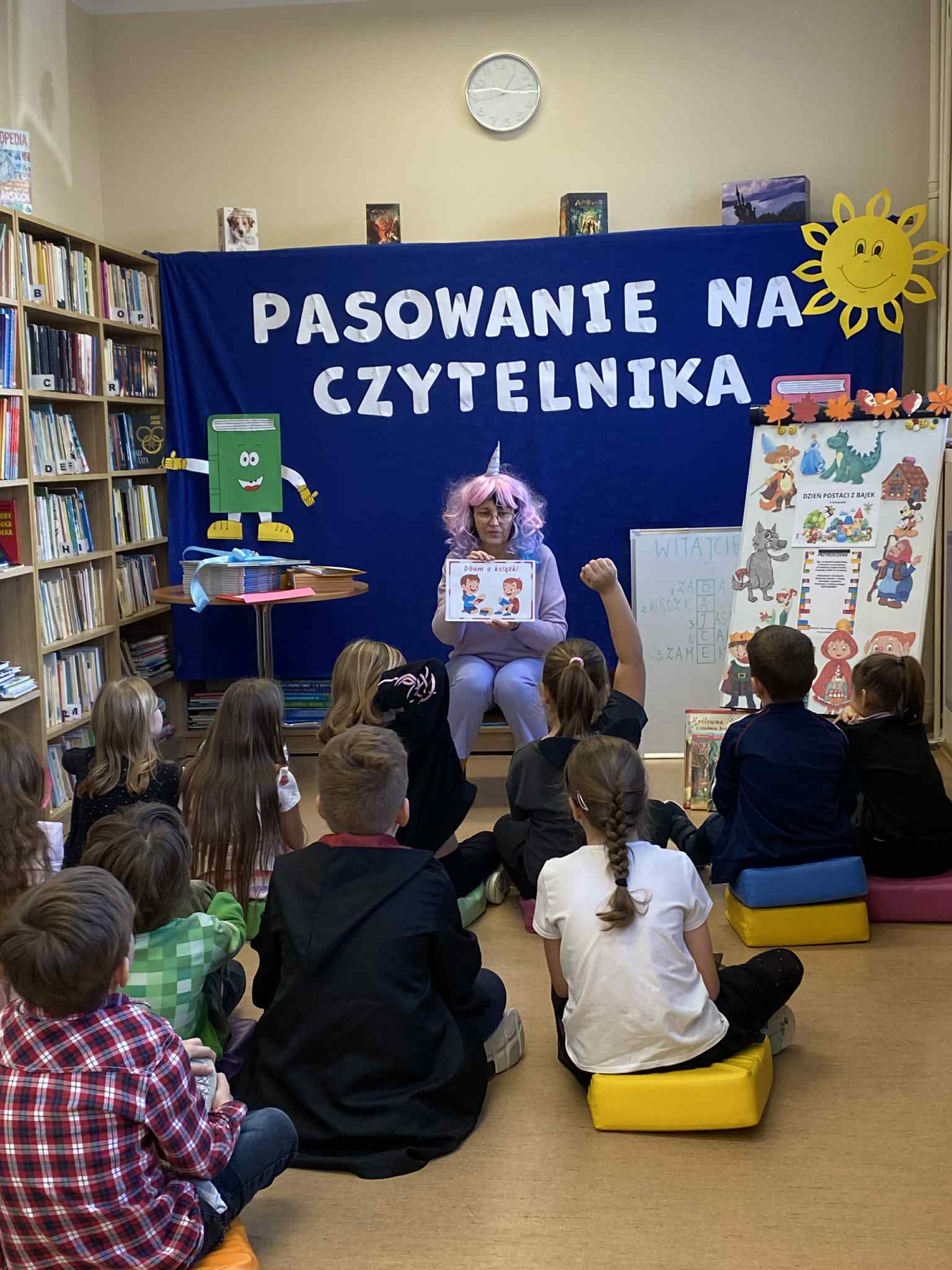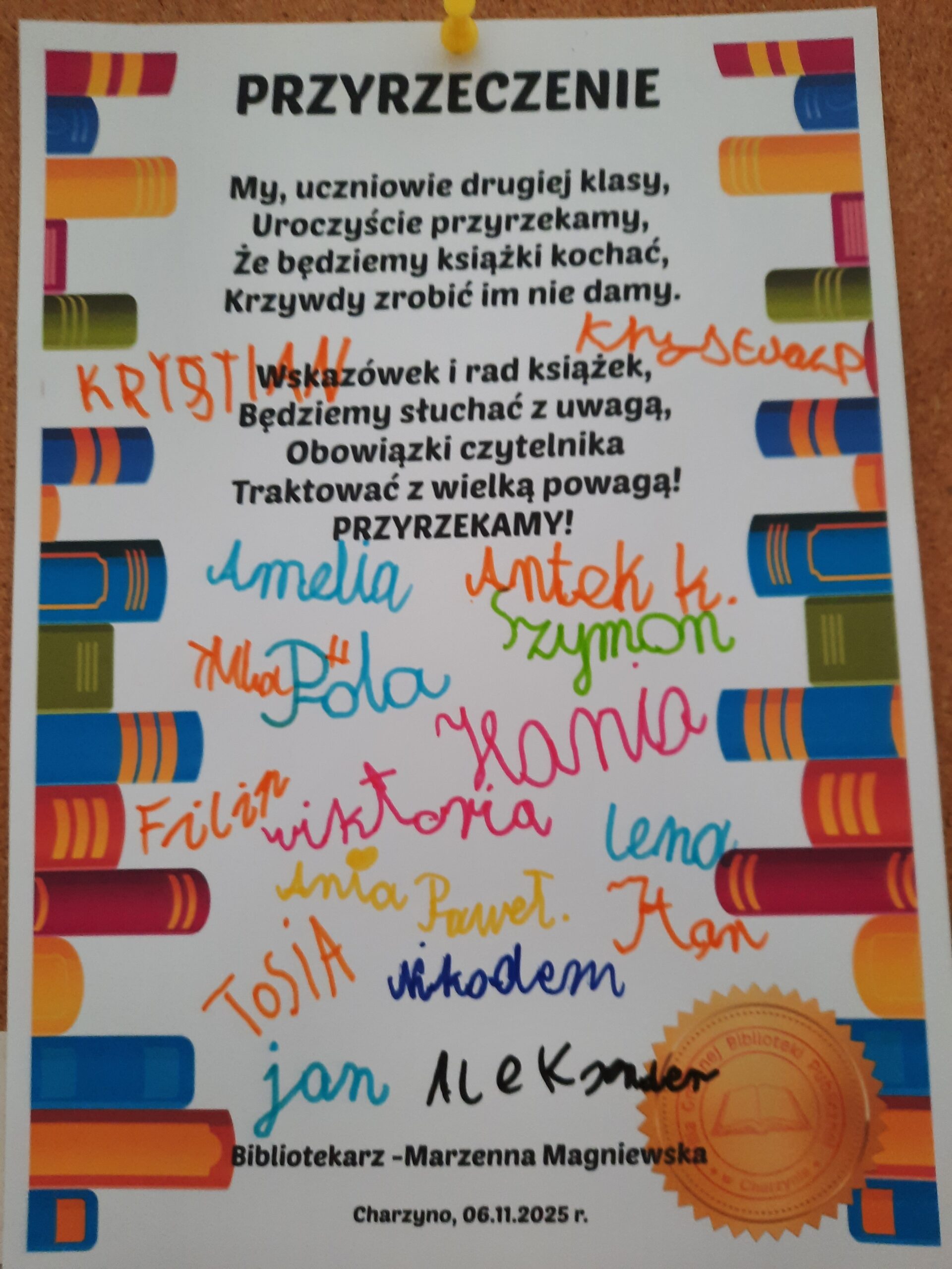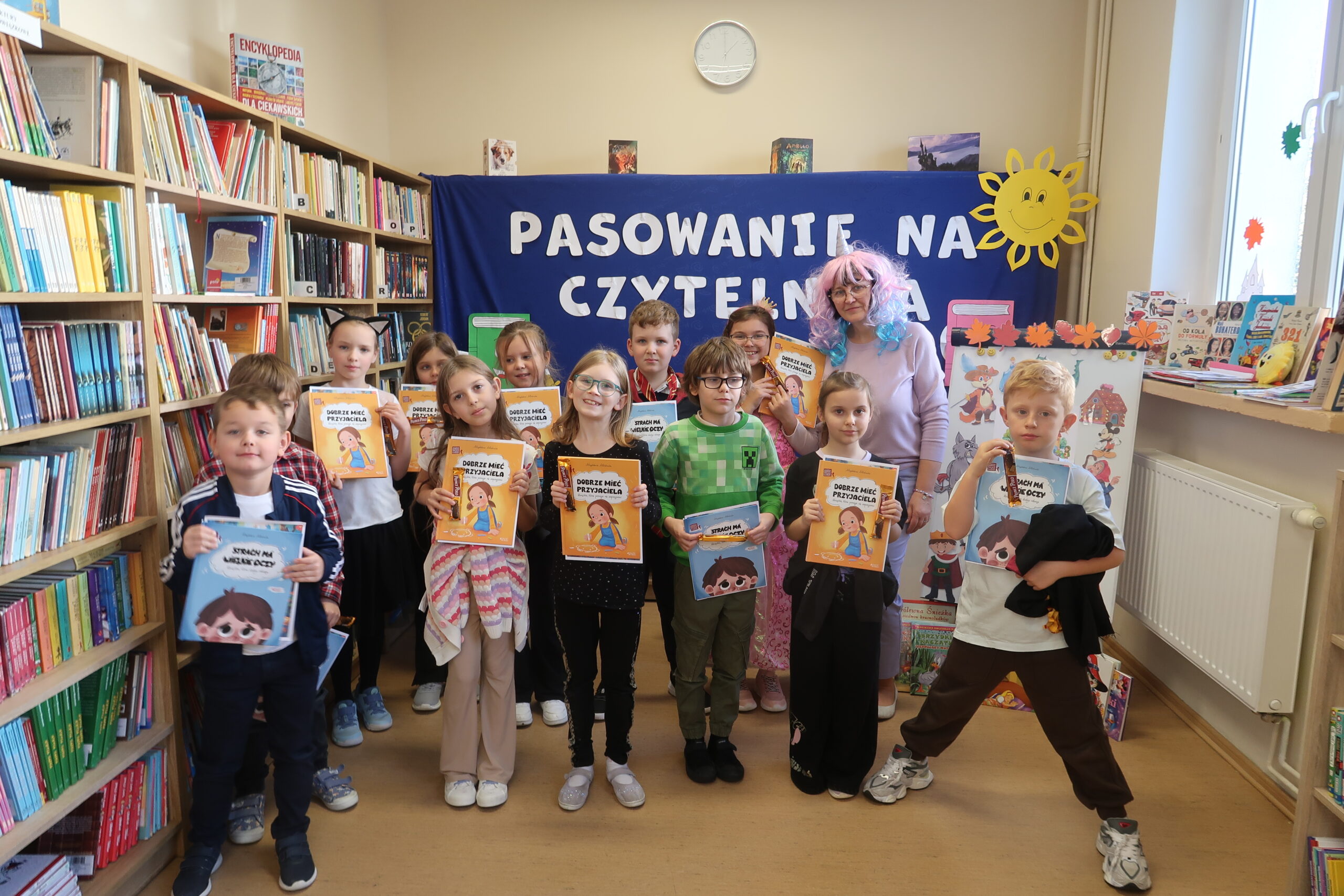 6 listopada w naszej szkolnej bibliotece panowała wyjątkowa, uroczysta atmosfera. Tego dnia uczniowie klasy drugiej zostali pasowani na pełnoprawnych czytelników. Zanim jednak przystąpili do złożenia uroczystego przyrzeczenia, wzięli udział w krótkim sprawdzianie wiedzy – musieli wykazać się znajomością zasad obowiązujących w bibliotece oraz umiejętnością dbania o książki. Dzieci z dużym zaangażowaniem odpowiadały na pytania, pokazując, że są gotowe, by mądrze i odpowiedzialnie korzystać z bibliotecznych zbiorów.